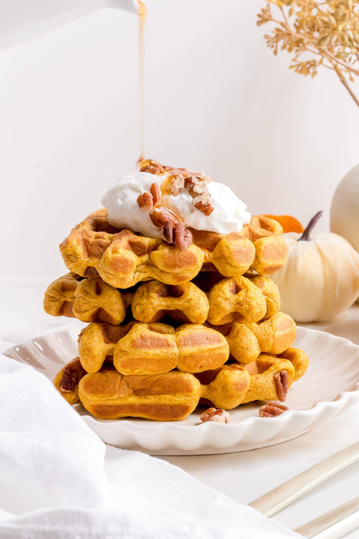 Vanilla pumpkin waffles topped with brown sugar, pecans and fresh whipped cream.