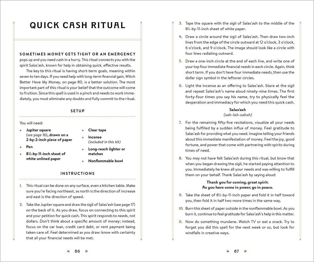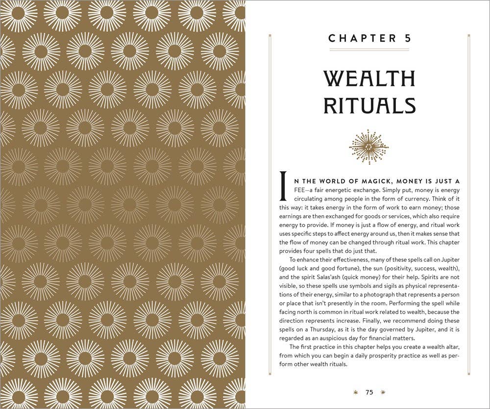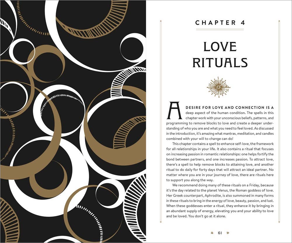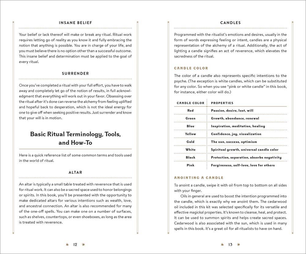 A Ritual Guidebook and Spell-Casting Kit•HC•2/c interior•From one of the fastest growing spiritual brands comes a beautiful spell-casting kit for modern mystics of all levels, this appealing shrink-wrapped package includes a black and gold-printed guidebook with twenty-five rituals and spells—illustrated with gorgeous specially commissioned patterns throughout and line drawings of essential symbols used in the spellwork—along with eleven candles, 3 cones of incense, and a small bottle of essential oil.